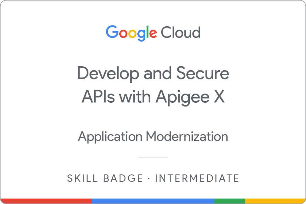 Earn a skill badge by completing the Develop and Secure APIs with Apigee X skill badge course, where you learn how to modernize your APIs, use service accounts and Google Authentication to securely access backend services from Apigee API proxies, productize APIs using API products and developer portals, secure APIs using features like API keys, OAuth, private variables and fault handling, integrate Apigee with Google Cloud services like Pub/Sub and Cloud Logging, and call Google Cloud APIs like the Natural Language API and the Geocoding API.