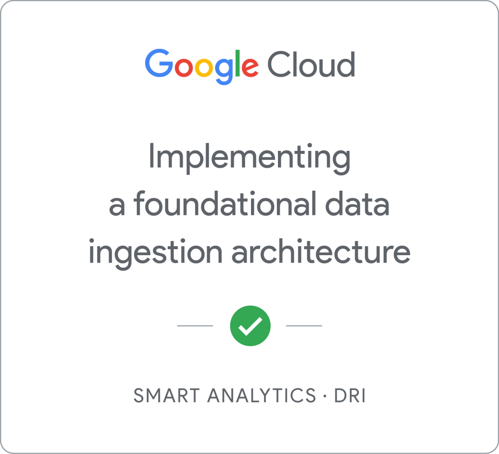 Earn a DRI badge by completing the Smart Analytics - Implementing a foundational data ingestion architecture quest, where you demonstrate your proficiency of Service Account credentials, IAM roles for accessing different data services: GCS, Dataflow, BigQuery and principles and application of service account impersonation. When you complete this activity, you can earn the badge displayed above! View all the badges you have earned by visiting your profile page.