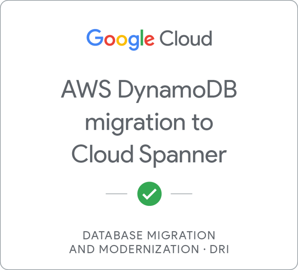 Earn a DRI badge by completing the Database Migration and Modernization - AWS DynamoDB to Cloud Spanner quest, where you demonstrate your profiency of performing an analysis of a source AWS DynamoDB environment, create a Cloud Spanner environment in Google Cloud, map schemas between the two, export the data to Amazon S3 and perform an import into Cloud Spanner with Dataflow. When you complete this activity, you can earn the badge displayed above! View all the badges you have earned by visiting your profile page.